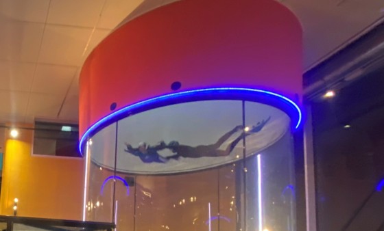Wat je vooral meekrijgt van de instructeur, die overigens altijd meegaat in “de buis”, is ontspannen. Probeer je rug hol te houden, armen en benen gestrekt en laat je meevoeren door de wind. Iedereen kreeg 5 sessies van 1 minuut. Aangezien het fysiek best zwaar was en ook wel redelijk moeilijk, (elke beweging van je hoofd of hand beïnvloed de kant die je “opvliegt”) waren die vijf minuten voldoende. In de laatste sessie neemt de instructeur (indien je dat wilde) je mee naar boven. Dan vlieg je echt meters hoog boven het net en komt dan ook weer netjes terug.
