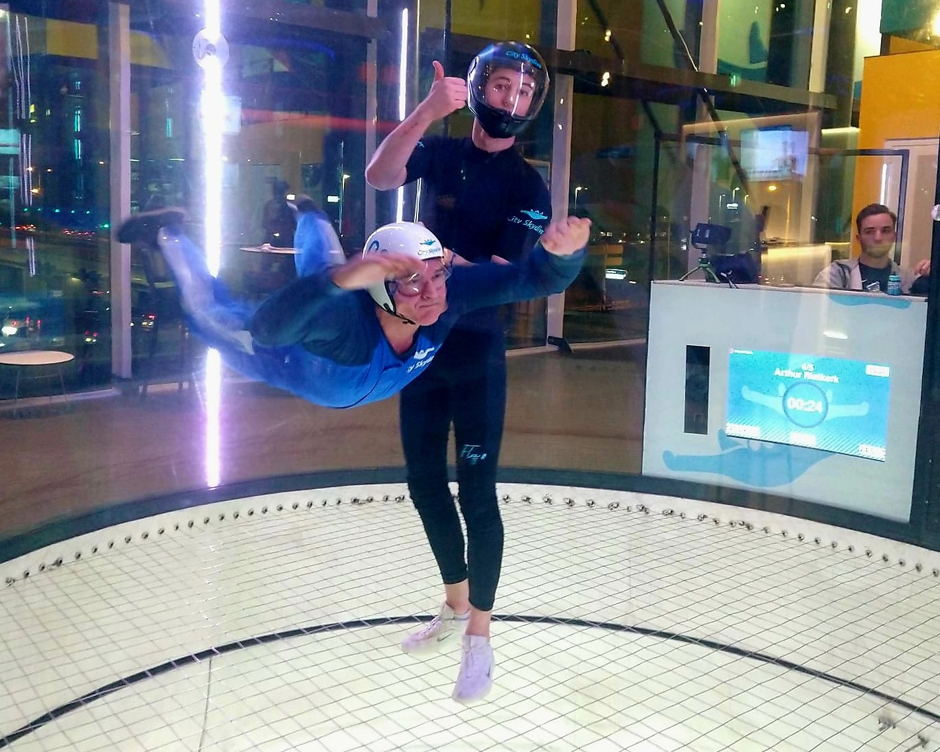 Ook staat er op je certificaat hoe hard de luchtstroom was. In mijn geval 168 km/u. En dan te bedenken dat je bij een echte vrije val ongeveer 200 km/u gaat en dat de ventilator van Skydive wel 300 km/u aankan. Maar dat is voor de echte professionals die ongelofelijk kunsten in de lucht kunnen uithalen. Misschien iets voor later, wanneer ik groot ben 😉.