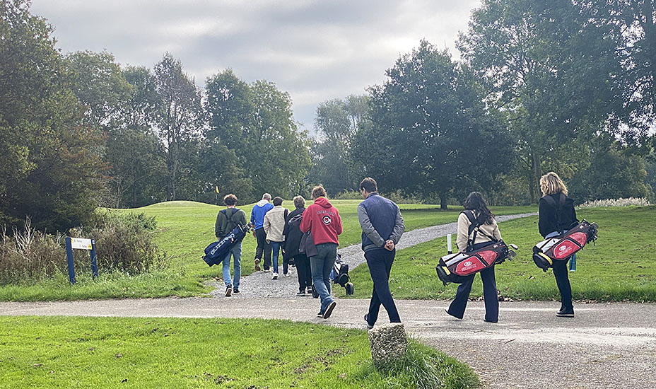 Na wat oefenrondes was het tijd voor het ‘echte werk’. We liepen richting de zogeheten F-holes en deelden ons op in groepjes. In deze spelvorm sloegen alle drie de groepsleden hun bal vanaf de tee, waarna je samen verder speelde vanaf de best liggende bal. Zo werkte je als team richting de hole.
